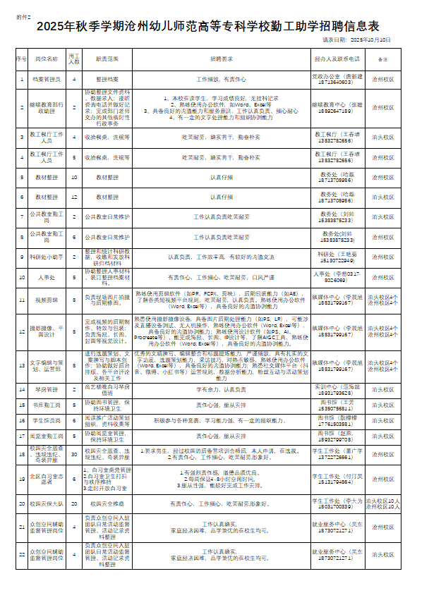 根据《沧州幼儿师范高等专科学校勤工助学管理办法(试行)》(沧幼专校字〔2023〕8 号)有关要求,2025年秋季学期学校勤工助学岗位已经审定,现面向全校家庭经济困难学生进行公开招聘各位。