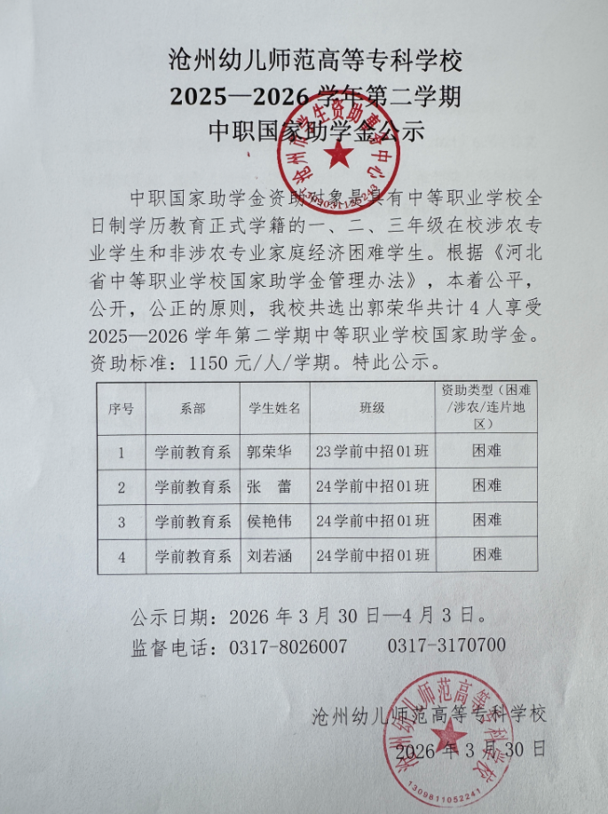 2025—2026学年第二学期中职国家助学金公示