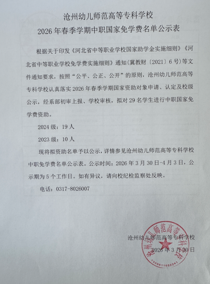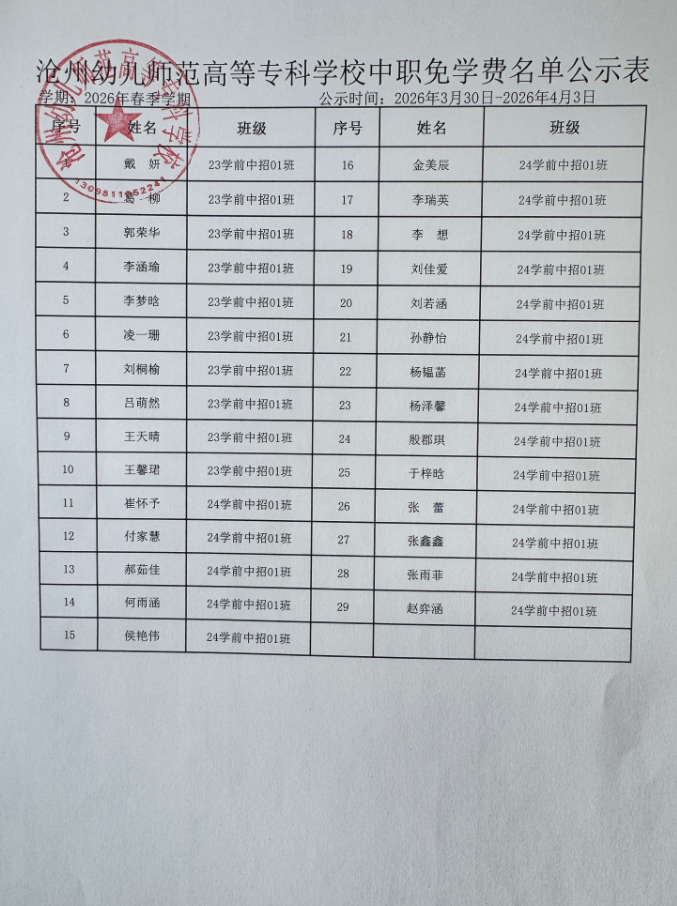 2026年春季学期中职国家免学费名单公示表